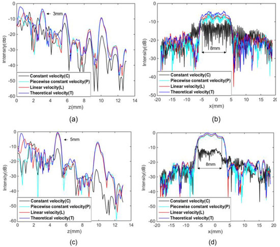 Furthermore, Figure 11b,d, present the sizing analysis by observing intensities along x-axis at z = 3 mm and z = 5 mm. Apart from the results from the velocity profile C, the quantification of the defect using the P, L, and T profiles velocities is seen to deliver appropriate consistency with the actual defect size. From Table 1 and Table 2, in the case of known size of the defect, the average intensity of the defect can be calculated by taking the mean value of the pixels belonging to the actual position of the defects. More importantly, the average intensity with T is seen to be approx. 9 dB and 7 dB higher than that with C for the 3 mm deep defect and 5 mm deep defect, respectively. Additionally, the differences between average intensity of P and L profiles as well as L and T profiles is at least 1 dB. In summary, the optimized TFM imaging using the velocity profiles of T and L undoubtedly prevail over the other two. For engineering practice, it might be inefficient to mathematically resolve the elastic constants using the Christoffel equation on a case-by-case basis. Therefore, it is more convenient to replace the elastic constant by simple linear function based on the knowledge of velocity profile characteristics in this study (i.e., a compromise between imaging quality and frame rate).