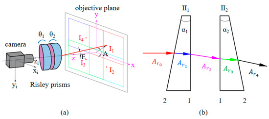 The RPIS system is shown in Figure 1a, and the prism structure with the combination 21-12 shown in Figure 1b is used in this paper, and the red solid line represents the imaging deflection optical axis of the camera, which is mainly represented by two parameters, namely the deflection angle E (the angle between the main optical axis z and the imaging deflection optical axis), and the azimuth angle A (the angle between the projection of the deflection optical axis in the target plane and the positive direction of the x-axis). The outgoing beam can be described in this way Ar4 = [Kr4, Lr4, Mr4]T [25].