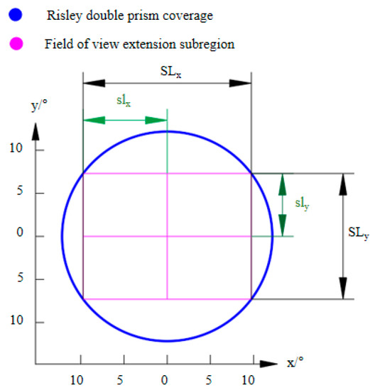 where is the horizontal angle of the camera and is the vertical angle of the camera, denotes the maximum deflection angle of the imaging visual axis, where, , denotes the number of sub-regions along the x and y directions in the FOV extension, respectively, and the extended lateral step and longitudinal step are obtained from Equations (6) and (7), so as to obtain the azimuth angle A and deflection angle E at each position, and the corresponding (θ1,θ2) at each position is obtained by combining with the exact inverse solution, so as to complete the position calculation of the FOV extension.