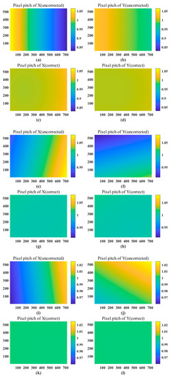 The distorted images at different positions correspond to the change in pixel spacing of the corrected images. In this example, f = 16 mm, n = 1.51421, α = 11°21′, p = 6.9 um, M = 540, N = 720 (a–d) (θ1, θ2) = (0°, 0°) distorted image corresponds to the pixel pitch variation of the corrected image in x and y directions. (e–h) (θ1, θ2) = (90°, 180°) the distorted image corresponds to the pixel pitch change in the x and y directions of the corrected image. (i–l) (θ1, θ2) = (130°, 280°) the distorted image corresponds to the pixel pitch change in the x and y directions of the corrected image.