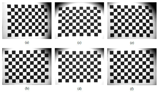 Section 3 analyzes theoretically that the correction of imaging distortions caused by nonlinear deflection of the Risley prisms is feasible. In order to verify the inverse ray tracing correction method, multiple images are acquired using RPIS pointing at different view axes, and the inverse ray tracing method is used to correct the real distorted images. The experimental scheme adjusts the camera imaging view axis to three different positions to acquire three real images. The images contain 12 × 9 black and white square patterns. It is often used as an image calibration and correction to facilitate the demonstration of four-point positioning and distortion correction effects [32,33,34], and the size ratio is set to 4:3 in order to adapt to the CCD chip size.The camera parameters are shown in Table 1, and Emax = 12.16° according to Equation (1). The lens used in this experiment has a small effect on the imaging distortion, so the lens distortion is not corrected.
