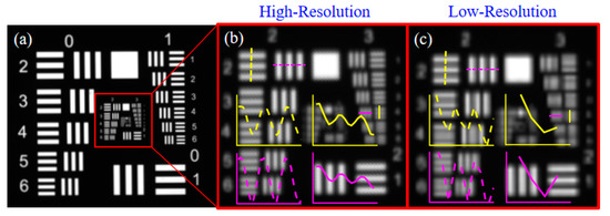 First, the U.S. Air Force (USAF1951) resolution plate was chosen to test the resolution limit of the camera, and to make the imaging quality better, a white light transmitter was added behind the resolution plate to provide uniform back light. The SR imaging results are shown in Figure 11. The middle image is the SR image of the red area, and the right image is the magnified portion of the red area of the LR image. The black and white stripe groups marked by yellow and magenta dashed lines indicate the gray gradient variation of the black and white stripe groups of the same element in the same group. In the HR image, the grayscale variation of the black-and-white stripe group in the first element of the second group in the HR image varies periodically with equal amplitude, while the grayscale amplitude variation in the LR image is larger and is the smallest stripe group that can be distinguished in the LR image. The black-and-white stripe group in the fourth element of the third group in the resolution plate is visible in the HR image with a periodic variation of grayscale change, but with a large fluctuation of amplitude, and is the smallest stripe group that can be distinguished in this image. Checking the resolution of the USAF1951 resolution plate we can get the resolution (number of line pairs) of the second group 2nd element as 4.49 lp/mm and the resolution of the third group 4th element as 11.31 lp/mm. The results show that the scene resolution of the SR image is increased by 2.5 times, which depends on the ratio of the resolution corresponding to the smallest stripe group that can be resolved in the HR image and the LR image. The reduction of the resolution reconstruction factor is mainly due to the mounting error, and the object distance measurement error. In addition, optical axis alignment, prisms relative zero calibration, and camera calibration all cause an increase in sub-pixel scanning error, which indirectly causes a decrease in the quality of SR reconstruction. However, compared to reference [7], which used a 5 × 5 camera array and achieved a resolution enhancement factor of 2.25, the proposed method uses a single camera to achieve a resolution reconstruction factor of 2.5, showing the potential for low-cost and efficient SR applications.