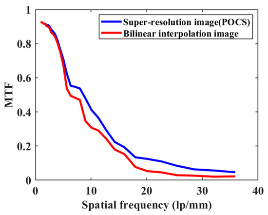 Third, to further test the quality of the SR reconstructed images of the proposed method, we calculated the modulation transfer function (MTF) of the prototype using tilted-edge imaging in the literature [35]. For comparison, we used LR images by bilinear interpolation to obtain images with the same resolution as the SR (POCS) images. Figure 13 shows the MTF of the SR image versus the bilinear interpolated image. The results show that the SR image using the convex set projection method has higher quality compared to the bilinear interpolated image.