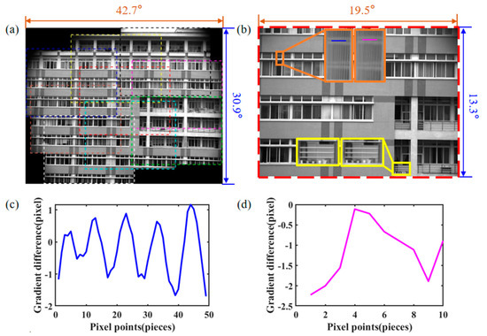 We perform SR reconstruction and FOV extension experiments of outdoor scenes to validate the proposed imaging method, where Figure 14a shows the stitched images of the prototype, including the stitching positions of the 9 sub-images (colored dashed boxes) and the final cropped images (yellow solid boxes). In the 9 images to be stitched, we use SIFT feature extraction, combined with the RANSAC algorithm to select the correct feature matching. The transformation matrix between each pair of images is obtained, and the images of all sub-regions are converted to a uniform coordinate system for mutual alignment by matrix multiplication. Finally, the overlapping area is smoothed based on the linear mixing strategy, and a composite image of 6592 pixels × 4540 pixels is obtained by cropping along the yellow solid frame. The FOV of the whole stitched image is 43.5° × 30.6°, the FOV of the cropped image is 35.7° × 22.4° and the FOV of the original camera is 19.5° × 13.3°. The size of the covered area is three times the size of the original camera’s FOV, and the FOV expansion ratio in the experimental results is slightly smaller than the theoretical value, and the deviation may be caused by the system installation error and the stitching algorithm error. In Figure 14b, the SR image is shown in the center of the extended FOV, and the two pairs of local areas are located in the upper left and lower right areas of the SR image. The flower pot and the fence in the lower right of the middle are recovered in the SR image.