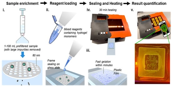 Data retriving process from the mgLAMP (i) Filtration. (ii) Reagent loading. (iii) Sealing. (iv) Incubation. (v) Imaging.