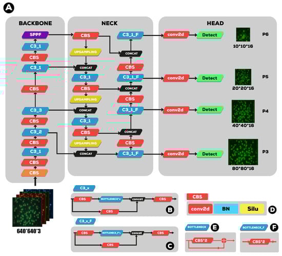 The proposed method for detecting and quantifying SARS-CoV-2 fluorescent cells that have been specifically marked with a fluorescent dye or protein in order to detect their presence in environmental water is based on the YOLOv5-s6 a variant of the YOLOv5 model. YOLOv5-s6 includes an additional output layer on 64 strides to detect more large-scale cells in addition to the three existing scales, as schematized in Figure 3. The model is flexible and compact with high real-time detection accuracy.