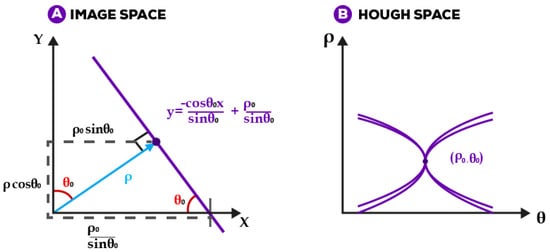 We are using the Hough transform in this case to detect lines. A line equation is represented in the Equation (2). The line is represented by the length of that segment and the angle that it makes with the x-axis in image space, as shown in Figure 4.