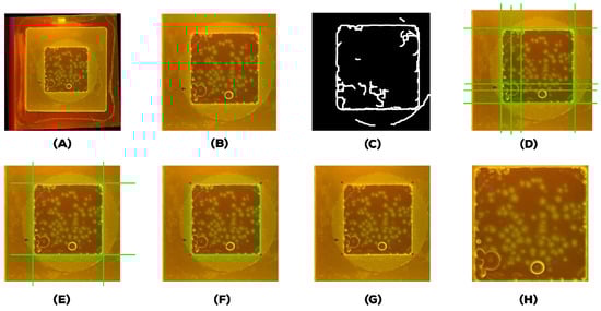 Figure 5. Steps of reprocessing: (A) rotated image, (B) zoomed image, (C) image after applying Canny edge detection, (D,E) intersection points identified using the Hough transform, (F,G) point selected for cropping the image, (H) cropped image. - Applying probabilistic Hough lines to find lines between 0.1 and 180-degree angles.