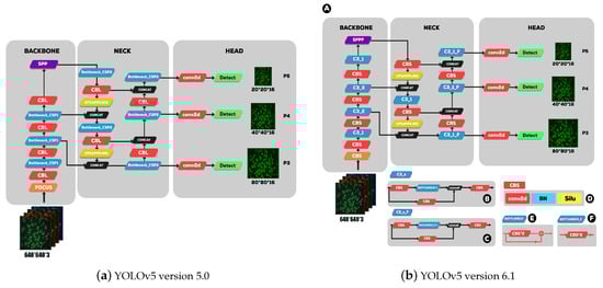 YOLOv5 provides four different scales for their model, S, M, L and X, which stand for Small, Medium, Large, and Xlarge, respectively. Each of these scales applies a different multiplier to the depth and width of the model, meaning that the overall structure of the model remains constant, but the size and complexity of each model are scaled. The basic structure of the previous YOLOv5 is largely divided into the backbone, the neck, and the detection head, as Figure 6a,b shows. The backbone consists of a convolutional neural network aggregating image features at various particle sizes. In contrast, the neck consists of a series of layers that mix and combine image features to deliver prior to prediction, and the head consumes features from the neck (PAnet) and takes box and class prediction steps. There are two major differences between previous YOLOv5 version 5.0 (as illustrated in Figure 6a and current (YOLOv5 version 6.1 as shown in Figure 6b).