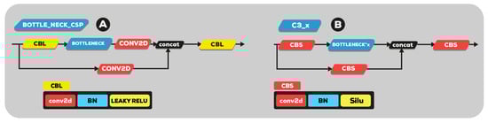 The same author transforms the bottleneck CSP (bottleneck layer) module, as illustrated in Figure 7A, into the C3 module Figure 7B. Its structure and function are the same as CSP’s and include three standard convolution layers and multiple bottleneck modules. The differences between the C3 and CSP modules is that the Conv module after residual output is removed, and the activation function in the standard convolution module after the Concat module is changed from LeakyRelu to SiLU.
