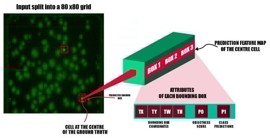 Figure 9. Example of a YOLOv5 workflow when applying a 80 × 80 grid to the input image. The input image is split into 3600 grid cells. Each grid cell predicts 3 bounding boxes and their objectness score along with their class predictions. - Objectness score (P0)—indicates the probability that the cell contains an object. The abjectness score is passed through a sigmoid function to be treated as a probability with a value range between 0 and 1. The objectness score is calculated as follows: