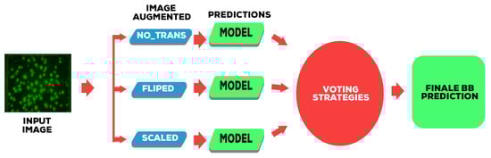Data augmentation [32,33] is a technique that was widely used to train deep learning models. It involved creating additional training samples from the original training dataset using transformations that did not change the data’s class. A variation of data augmentation, known as test-time augmentation [34], was used for the test dataset. This approach generated random variations of the test image, made predictions for each one, and then produced an ensemble of those predictions. In image classification, test-time augmentation (TTA) was straightforward, as it involved executing various picture transformations (such as flips, rotations, color transformations, etc.), making predictions for each one using a specific model, and then returning the ensemble of those predictions. However, TTA is not as simple when it came to object detection because some transformations, such as flips or crops, changed the position of the objects. In more detail, given an image and a list of detections, detection transformation is an operation that returned a transformed image and a list of detections. We applied each image transformation to obtain new images as a result, as shown in Figure 10. Subsequently, we detected the objects in each image using the object detection model and produced lists of detections. For each result, we applied a detection transformation that returned a list of detections in the correct position for the original image. Finally, we ensemble the predictions using one of the three voting strategies (NMS (nonmaximum suppression), affirmative, consensus, or unanimous) [35].
