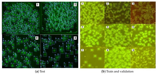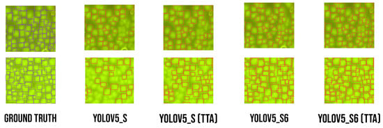 In Figure 16, two examples of images are presented to illustrate the excellent detection results. The reason why using TTA impacts the result dramatically was because TTA applies various scale transformations with the following values [2,1,0.83,0.63] that help detect cells with different input sizes and select the best results with a voting algorithm, as shown in Figure 16. However, as we can see in Table 3, TTA has a direct impact on increasing the inference time.
