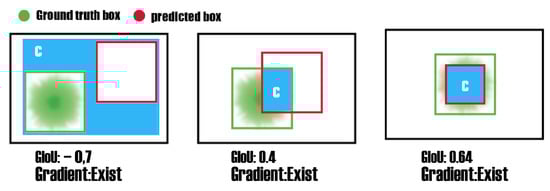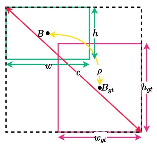 As CIoU loss uses complete geometric factors as you can see in Figure 14, it converges faster than GIoU loss [37]. It improves average precision (AP) and average recall (AR) for object detection. Equation (11) represent the CIoU loss.