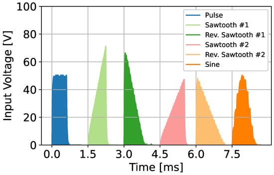 Here, we set the maximum values for each participant determined by calibration as . Furthermore, as shown in Section 4.2, the pulse wave with 0.6 ms, , was an appropriate waveform to display without discomfort. Thus, we multiplied the pulse wave , and the displayed force , and created the input voltage (Equation (5)).