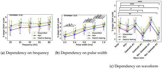 In Figure 3a–c, the orange lines show the answer of “discomfort”, the blue lines show “pain”, and the green lines show “electric feeling”. The vertical axes are the evaluation results on a 5-stage Likert scale. The maximum value is 5 and the minimum value is 1, and the larger the value, the greater the sensation. Each horizontal axis represents the frequencies, pulse widths, and waveforms of the input stimuli. Pairwise comparisons between each condition after one-way repeated measures ANOVA were made using Scheffe’s F-test.