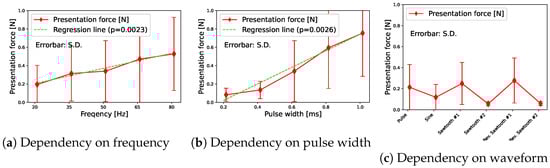 Next, we show the measurement results of the presentation force for each frequency, pulse width, and waveform condition. Figure 4a shows the results of the frequency change. Figure 4b shows the results of the pulse width change. Figure 4c shows the results for each stimulus waveform.