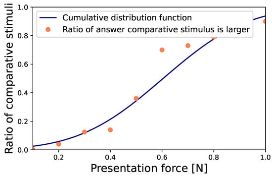 The vertical axis represents the probability that the comparative stimulus was greater than the constant force (0.3 N of EMS) determined by the participants (ratio of determination being greater). The horizontal axis represents the magnitude of the comparative stimulus. Each data point shows the probability that participants determined the comparative stimulus to be greater. The solid line shows the result of the interpolation by the cumulative distribution function. From the results, we got the PSE as 0.6 N. Here, the ratio of the comparative stimulus considered to be greater is 0.5. Furthermore, we got JND as 0.2 N. Therefore, participants could distinguish between physical force with a difference of 0.2 N. With EMS force, they would notice a difference of 0.1 N. When the EMS force was 0.3 N, participants felt that the force was twice as large as the actual force. In other words, the participants subjectively felt that the force of the EMS was twice as large as the force of the motor.