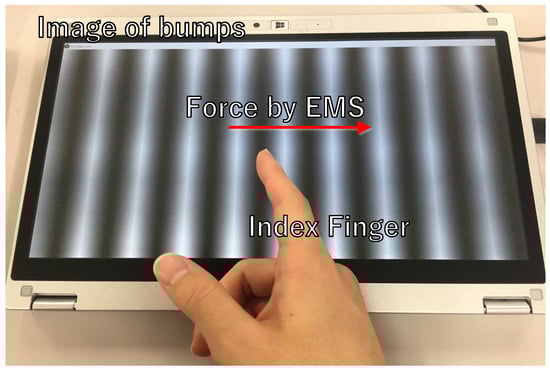 In this section, we explain the haptic augmentation experiment. As shown in Figure 7, we presented AR-like virtual bump haptic stimulation by augmenting the shear force on the fingertip moving on the screen.