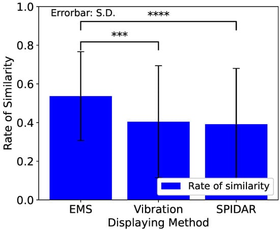 Overall results between methods; the vertical axis is the average similarity for each method. There were statistically significant differences between EMS and vibration and EMS and SPIDAR. *** and **** represent significance levels of 0.05%, and 0.005%.