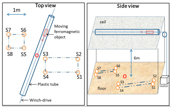Our setup consists of eight vector magnetometers arranged on the ground according to the grid shown in Figure 2. The geometry is chosen to imitate a shallow water deployment in the vicinity of a harbor entrance. Six meters above, a plastic tube is attached on the laboratory ceil. Within the tube, a non-ferromagnetic winch-drive activated by a pulley allows for the motion of the ferromagnetic object. The velocity is motor-controllable from the ground. The only unknown variable remains the moment of the moving object, which we let the algorithms calculate together with the coordinates of the sensors.