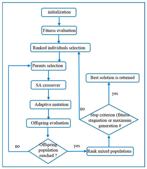 To summarize, the NSGA-II algorithm uses two populations: a parent population P of size N and an offspring population Q, which consists of the set of individuals that have been created by the application of the GA operators. At each iteration, the two populations are combined in an intermediate population, R, and sorted to obtain the Pareto sets. Finally, a new population P’ consists of the best Pareto sets of population R. To achieve this, the solutions of the Pareto sets are included in the population, until the size becomes greater than or equal to the size, N, of the initial population. If, following the addition of the last possible set of Pareto, the population size is greater than N, then the last set is sorted according to the crowded distance, and the solutions with the smallest distances are eliminated until size N is achieved. The selection operator, crossing, and mutation are then applied to P’ to create the new population, Q’, and so on. A basic flowchart of NSGA-II is shown in Figure 4.