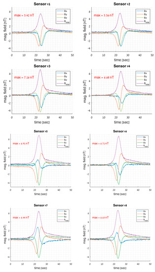 Figure 5 displays the sensor-measured raw data. Keep in mind that the maximum amplitude values for the near and distant sensors are different: [7.16 6.91 6.71 6.68] nT for sensors #3, #5, #6, and #4, respectively, and [5.42 5.56 6.44 6.63] nT for sensors #1, #2, #7, and #8, respectively. With just an amplitude variation, the sensors on the same side of the trajectory display identical phases throughout each axis. For the sensors located on a separate side of the trajectory, the x phase is the opposite.