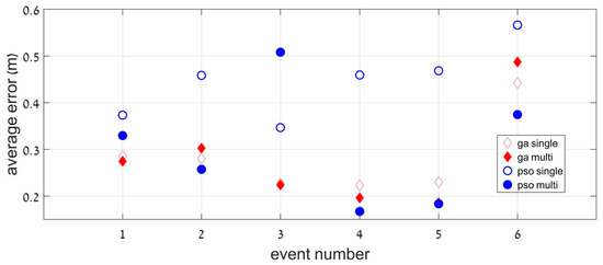 An overall look at Table 1 and Figure 5 shows that the results are excellent. This is particularly encouraging regarding the very large size of the search space. Figure 5 shows that the algorithms were insensitive to the direction, velocity, and moment of the crossing event. Event #6 shows a larger error due to the distractor presence, although its best median location error was only 40 cm. This means that even in more realistic conditions, our method can provide a precise and reliable location of the grid. Overall, the multi-objective optimization is the most appropriate method, either for the GA or PSO algorithm. A remarkably small averaged error (less than 30 cm) was found in both cases.