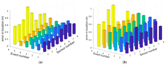 Deviation from exact location (in m) for each event and for each sensor. (a) and (b) are the best (MOGA) and the worst (SOPSO) results, respectively.