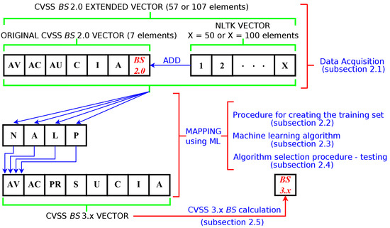 In this section, we describe the method used in this contribution to convert the CVSS 2.0 to the 3.x standard. The proposed procedure includes four steps—data acquisition, the selection of the training set, the selection of the Machine Learning (ML) algorithms, and their testing [16,17].