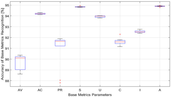 We also note that the results presented in Table 5 have small values of the standard deviation with the largest values of the standard deviation observed for the PR and AV components of the CVSS 3.x vector. The results from Figure 2 show also that the PR component has two outliers, which occurred for more than three percent below the median. Outliers occurred also for components S, C, and A. However, in those cases, they were less critical. Comparing the results shown in [40], there was a noticeable improvement in the observed accuracy for all the components of the CVSS 3.x vector. In particular, the lower and upper quartiles for the components S and A significantly reduced. This improvement is critical for the accurate calculation of the CVSS 3.x base score, as will be explained in more detail in the next paragraph.