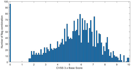 In order to explain why it is difficult to achieve high accuracy for the CVSS 3.x , we plot in Figure 3 a histogram, which shows the number of class index combinations (number of scenarios) for the CVSS 3.x base vector that map onto a particular value of the base score. We note that the total number of all class index combinations was 2592, while the value of was in the range of 0–10 with a resolution of 0.1, i.e., there were theoretically 101 distinct values. The results from Figure 3 shows that the number of class combinations corresponding to the individual values of the CVSS 3.x score vary with the score value, i.e., the distribution is not uniform (Figure 3). These results show also that, for some CVSS 3.x values, there are no corresponding CVSS 3.x vectors. For instance, there is a large gap between the of 0.1 and 1.5. In other words, no matter how one selects the values of the CVSS 3.x vector component flags, the calculated score will not fall between 0.1 and 1.5. Furthermore, for = 9.5 and = 9.7, there is no corresponding combination. Further, for = 9.8, we have only one combination. In contrast, for = 5.7, there are as many as 79 different base vectors, while the value of = 0 can be obtained using 96 different flag combinations. The particularly large number of CVSS 3.x vectors mapping onto the 0 score follows from the fact that a zero score was obtained when C = I = A = 0.