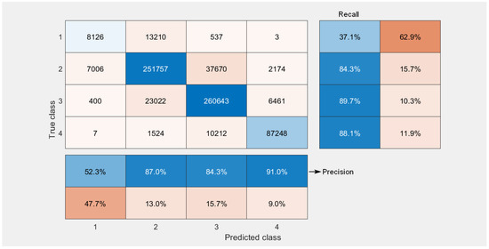 The quality of the classification was estimated by calculating the precision, recall, and F1-score. The results obtained from the 10 testing trials of the algorithms with a randomly selected 71,000-element testing set are shown in Table 6. Generally, the quality of the prediction was good. However, the presented statistics indicate that some imperfections were still present despite all the effort invested in the tuning of the model hyperparameters. Especially, there were problems with the parameter A for class index = 2, the parameter AV for class index = 1, and the PR for class index = 3. In order to address these difficulties, some further development of the proposed method will be necessary in the future.