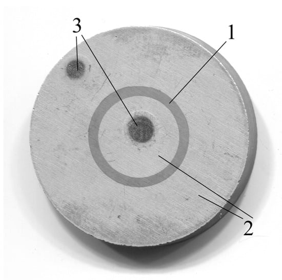Then, new aluminum electrodes were applied to the piezoceramic blank. The application of new aluminum electrodes was carried out by vacuum spraying on the VUP 5 installation through a specially made nickel mask in the form of a ring. The ring was fixed on top of the piezoceramic disk using a permanent magnet. The position of the mask on top of the resonator was controlled using a microscope, so the positioning accuracy was about 20 μm. The thickness of the obtained aluminum electrodes was about 2000 Å. The resulting resonator is shown in Figure 2.