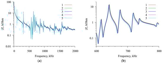 Frequency dependencies of the module of the electrical impedance of a free radial electric field excited resonator at different temperatures. (a) General view of dependencies; (b) magnified view in the range of 600–800 kHz. Curves 1—25 °C, 2—30 °C, 3—35 °C, 4—40 °C, and 5—45 °C.
