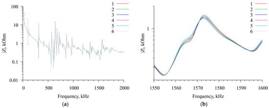 Frequency dependencies of the electrical impedance modulus for a radial electric field excited resonator loaded with a film of chitosan acetate at different times of exposure to ammonia vapors. (a) General view of dependencies; (b) magnified view in the range of 1550–1600 kHz. Curves 1—0 min, 2—100 min, 3—200 min, 4—300 min, 5—400 min, and 6—480 min from the beginning of the experiment.