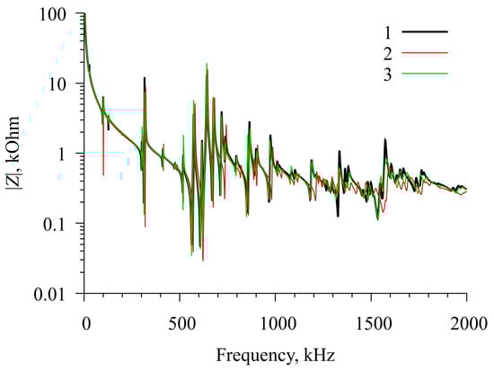 Comparison of the results of the measurement and calculation of the frequency dependence of the electrical impedance for a free radial electric field excited resonator at a temperature of 35 °C. Curve 1 is the measurement result, curve 2 is the result of calculation using the original material constants, and curve 3 is the result of calculation using the refined values of the material constants.