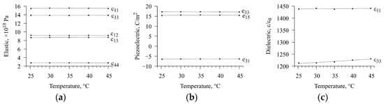 The parameters of the model that were subject to refinement were 10 material constants (5 independent components of the elastic moduli, 3 components of the piezomoduli, and 2 components of the dielectric permittivity). The procedure for refining the material constants (fitting) was carried out for each of the measured resonance curves at 5 different temperatures. The geometry of the resonator and the density of the ceramics were rigidly set and did not change during the fitting process. The Nelder-Mead algorithm [] with adaptive parameters was used for fitting, which increased the convergence rate of the algorithm []. The completely fitting procedure is described in detail in [,,]. The refined values for each material constant at a certain temperature are graphically represented in Figure 7 as black dots. Then, the values of material constants at a temperature of 35 °C and temperature coefficients with a temperature change of 1 °C were determined using the linear regression method, which is presented in Table 2. These results are presented in Figure 7 in the form of straight gray lines. The density of the ceramics was determined directly. The initial values of the remaining material constants were taken from [].
