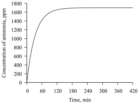 First, based on the free internal volume of the chamber (75 mL) and the area from which ammonia was evaporated from water solution (2.8 cm2), as well as the ambient temperature (26 °C), the expected concentration of ammonia in the air atmosphere for our chamber from time was calculated (Figure 8).