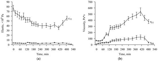 The results of fitting the mechanical material constants of the chitosan acetate film from the run time of the experiment. (a) elastic moduli; (b) viscosity moduli.
