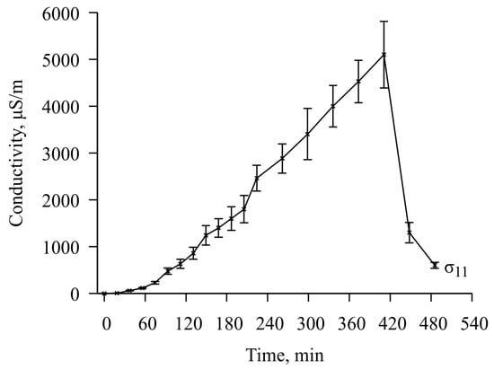 As a result, it was found that with the camera lid closed for 420 min, the elastic modulus of the chitosan acetate film decreases by about 50%, the viscosity increases by 6 times, and the electrical conductivity increases by 4250 times (the dry film conductivity is 1.2 µS/m., the maximum conductivity is 5100 µS/m). At the same time, despite the constant concentration of ammonia within 120–420 min after the start of the experiment, the conductivity value continues to increase almost uniformly. The growth limit of this parameter was not reached in this experiment. After opening the lid for 60 min, the values of all parameters decrease rapidly, but complete relaxation does not occur. The final restoration of the initial parameters of the chitosan acetate film takes no more than 18 h.