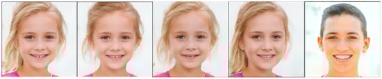 - Wu, Z.; Lischinski, D.; Shechtman, E. StyleSpace Analysis: Disentangled Controls for StyleGAN Image Generation. In Proceedings of the IEEE/CVF Conference on Computer Vision and Pattern Recognition, Nashville, TN, USA, 20–25 June 2021. [Google Scholar] [CrossRef]