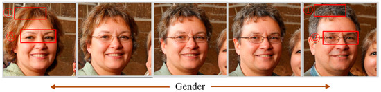 Supervised methods can edit images accurately but it is difficult to obtain semantic labels, so unsupervised methods have gradually become a new research trend. The unsupervised methods do not require external semantic attribute labels; they mainly utilize the potential semantic directions in the latent space of the GAN [16]; the parameters are trained in the generator network [17]. PCAGAN [18] utilizes principal component analysis (PCA) [19] to determine the main feature direction of controlled editing in the latent space of the GAN; find the main direction of image semantic attribute; however, its result depends on the number of sampled points in the latent space and the entanglement between each semantic attribute is serious. SefaGAN [20] proposed that the main semantic attribute directions of the generated images are the eigenvectors of the fully connected layer weight matrix in the pre-trained model of the StyleGAN2 network. It can obtain interpretable image semantic attribute directions, but its equivalent model is not complete. It equates the mapping function in the generator network with the fully connected layer of the style layer; while omitting the mapping function of other layers in the network, which results in the actual editing process that still has semantic attribute entanglement [21]. As shown in Figure 2, when editing along with the gender semantic attribute direction, the faces in red boxes 1 and 2 have added glasses, and the hair color has changed. STGAN-WO [22] controls image generation at two scales separately in the latent space and achieves disentanglement of image structure from texture semantic attribute using weight orthogonal regularization, but its regularization method limits the weight space in the network; consequently, reduces the quality of the generated images. Chen et al. [23,24]. achieves good results using spatial features of deep convolutional neural networks for image feature detection. The multi-scale hierarchical disentangled image editing method [25] achieves more accurate image editing on the multi-scale feature space, in which the weight matrix at different resolution layers of the StyleGAN2 generator network is decomposed and the semantic attributes between different resolution layers are disentangled by using Schmitt orthogonal decomposition, however, it does not fundamentally change the limitations of the weight matrix eigen decomposition method, but only alleviates the semantic entangled phenomenon at multiple scales. LowRankGAN [26] obtains the Jacobi matrix by calculating the partial derivatives of the generated feature map of the GAN with each vector element of the input latent space; obtain the image editing directions by employing low-rank approximation and SVD decomposition to the Jacobi matrix. It achieves better editing results than the previous methods, but the calculation of the Jacobi matrix is time-consuming and memory-intensive. Hessian Penalty GAN [27] adopts the idea of the Jacobian matrix to restrict each dimension of the input latent space by orthogonal regularization, the method achieves different semantic attributes of the generated image controlled by different dimensions of the latent space, but the restriction of different dimensions to control a single semantics is too strict, and the editing does not work well on models with large hidden space dimensions such as StyleGAN. OroJaRGAN [28] relaxes the orthogonal regularization constraints on the basis of Hessian Penalty GAN, the method achieves good results on large GAN models.