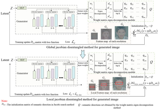 The proposed method in this paper, shown in Figure 3, is mainly composed of the global Jacobian disentangled method and the local Jacobian disentangled method. In the global Jacobian disentangled method, the generator network uses the pre-trained StyleGAN2 model, our method first utilizes the weight matrix eigen decomposition method in the pre-trained network to obtain the original semantic attribute directions that are used as the initial direction set of the Jacobian orthogonal regularization; subsequently utilizes the loss function to train and update to obtain the final image editing direction. Compared with the common Jacobi orthogonal regularization method OroJaRGAN, we optimize the way of initialization during semantic direction search to improve the time efficiency and the proportion of effective semantic directions. The local Jacobi method, compared with OroJaRGAN, limits the search area of the image feature space, which utilizes a local contrast regularized loss function to relax the semantic association local area and non-local area and enables the local Jacobi disentangled method to obtain the local accurate semantic direction that cannot be searched by traditional methods and improve the editing effect of the generated image.