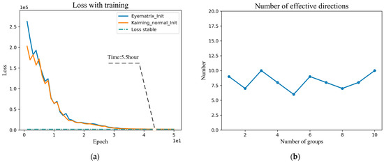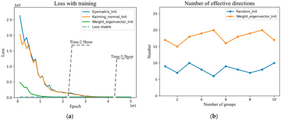 Figure 5 compares random initialization and the initialization by the eigenvectors in this paper in terms of the convergence time of the loss function and the proportion of effective vectors. In Figure 5a, the Jacobi orthogonal regularization search algorithm based on the weight matrix eigendecomposition improves the search efficiency by reducing the training time from 5.5 h to 2.5 h than the Jacobi orthogonal regularization search algorithm. In Figure 5b, the eigenvector initialized Jacobi search algorithm has an average effective direction of 18 and a maximum value of 20 among 40 initialization direction vectors, which is double the proportion of effective directions of random initialization. The experiments demonstrate the effectiveness of the global Jacobi disentangled method.