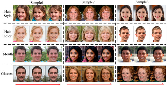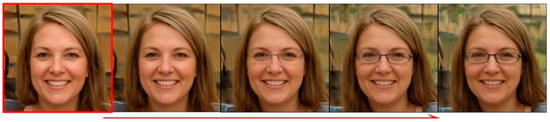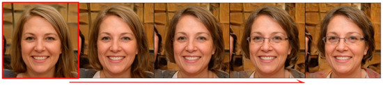 - where = 10−4 represents the range moved during editing, is the perceptual distance between the two generated images [41], and represents the generator. The two sampling points corresponding to the images are the intermediate latent space and its points along the unit attribute direction shift .