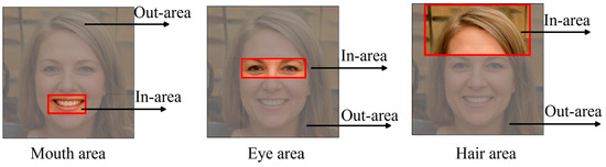 We observe that the semantic attributes of most images in the FFHQ dataset trained by the StyleGAN2 network are relatively fixed in position on the feature space. Inspired by the local area mask idea of MaskGAN [35], Editing in Style [36], we proposed a local Jacobi orthogonal regularization search method based on a priori rectangular mask. Compared with the global Jacobi disentangled algorithm, the local Jacobi disentangled algorithm limits the feature map area searched at each resolution layer; divides the feature map of each resolution layer of the generator into two parts: local In-area and non-local Out-area; finally completes the local semantic disentanglement for the local feature map according to the Jacobi disentangled method in Equations (2)–(6). Figure 7 shows the mouth, eye, and hair areas of a human face. We define the red box as the local area of relevant semantic attributes and the non-local area outside the red box.