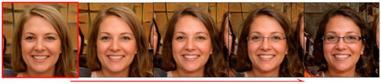 - Shen, Y.; Gu, J.; Tang, X.; Zhou, B. Interpreting the Latent Space of Gans for Semantic Face Editing. In Proceedings of the IEEE/CVF Conference on Computer Vision and Pattern Recognition, Seattle, WA, USA, 13–19 June 2020; pp. 9243–9252. [Google Scholar]
