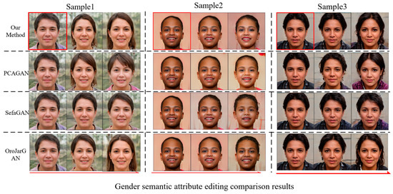 Our method is similar to OroJaRGAN in terms of PPL metrics because the search method is the same, only the semantic direction is initialized in a different way. Referring to papers [42,43], the equivalent model of SefaGAN considered only that the role of the mapping function in the network is limited to the style layer, ignoring the role of other layers. the effect of PCAGAN depends heavily on the number of sampling points. In contrast, our method resembles an end-to-end form when computing the Jacobi matrix without the problems of the two methods above. So, our method has an improvement in the PPL metric.