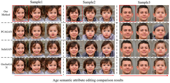 We utilize PPL to evaluate the performance of the global Jacobi disentangled method compared with the three mainstream unsupervised generated image editing methods, SefaGAN, PCAGAN, and OroJaRGAN, on the FFHQ dataset. The comparison results shown in Table 2 suggest that the performance of our method and the OroJaRGAN method is close and slightly better than the other two methods, but the training efficiency and search efficiency of our method are significantly improved compared with OroJaRGAN. Figure 10 and Figure 11 show the comparison of the four editing methods for two semantic attributes, gender, and age, on the FFHQ face dataset. In two examples, the PCAGAN method has entanglement with age attribute on gender attribute editing and more serious entanglement with hair attribute on age attribute editing; SefaGAN has an insignificant effect on gender attribute editing and more serious entanglement with pose occurs on age attribute editing. In contrast, the OroJaRGAN method and the proposed method obtained more reasonable results.